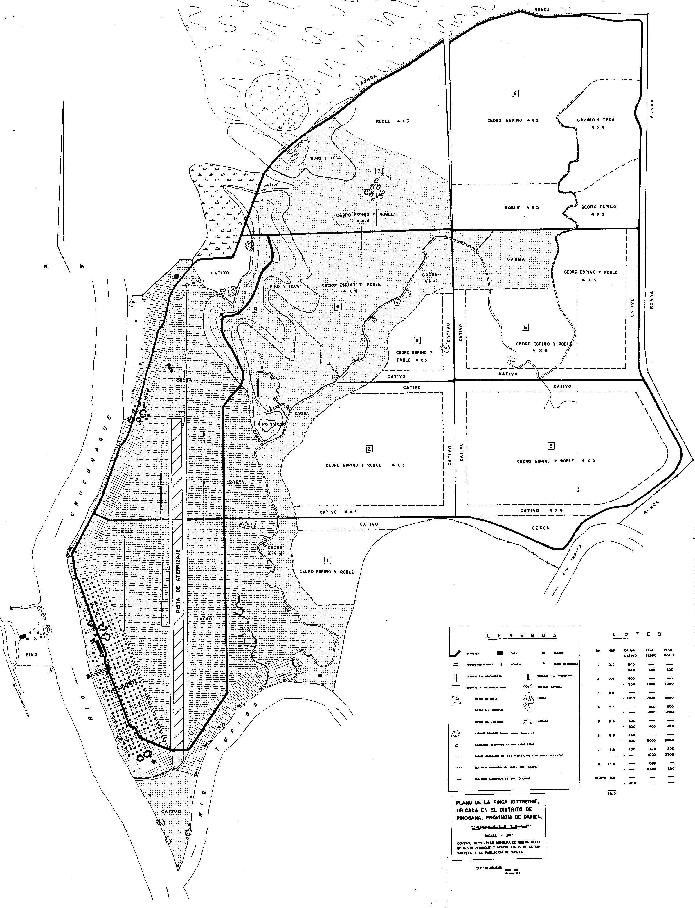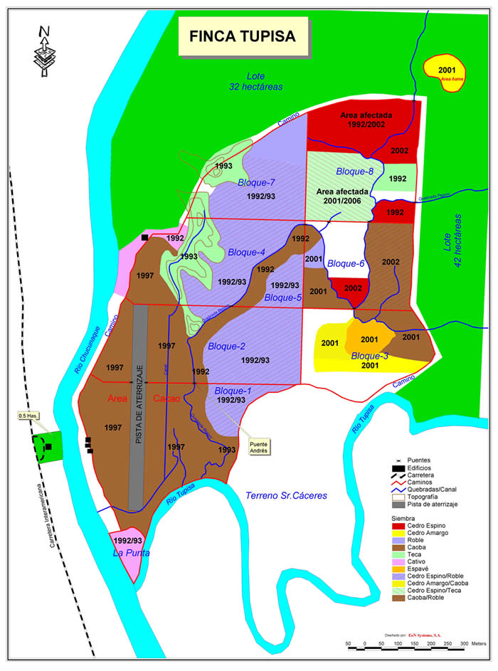 The 145-hectare area is comprised of three lots: a V-shaped 71-hectare lot at the confluence of the Chucunaque and Tupisa rivers which is mostly reforested, a 42-hectare lot on the east which is partially reforested, and a 32-hectare lot on the north which is not planted. The total reforested area of 80.5 hectares is subdivided by a network of wide grass trails for access to section blocks or individual stands of trees. There is an extensive drainage-ditch grid which functions ecologically and carries ground-water off to the Chucunaque and Tupisa rivers. Two small streams meander through the area as well which are crossed by wooden bridges where they intersect with the trails. There is also a double firebreak around the perimeter of the plantation for protection during the dry season.